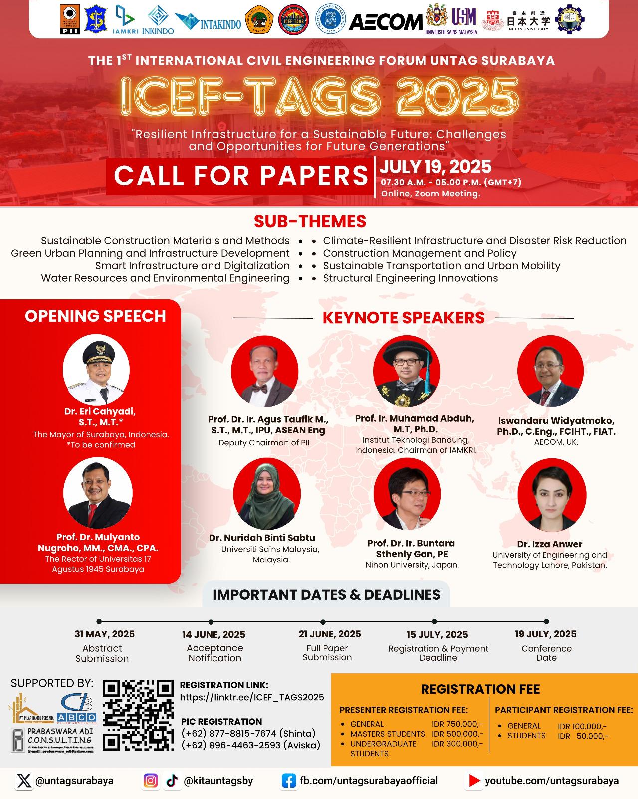“The 1st International Civil Engineering Forum - Untag Surabaya (ICEF-TAGS) 2025” brings together academics, researchers, practitioners, and policy makers to discuss various innovative approaches in building resilient and sustainable infrastructure for future generations in the field of civil engineering under the grand theme: